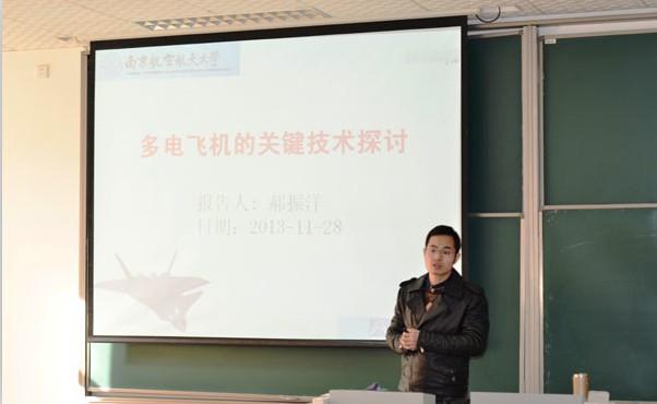 2013年11月28日上午10时,国产传媒 “紫冬话坊”系列讲座活动之“术响南航”青年教授论坛第一场学术讲座在A18号楼231教室顺利进行。本次活动很荣幸邀请到了电气系青年教师郝振洋副教授为国产传媒 研究生作题为“多电飞机的关键技术探讨”的学术讲座。