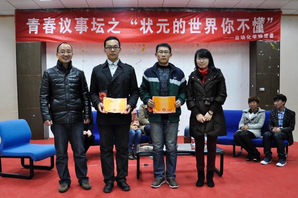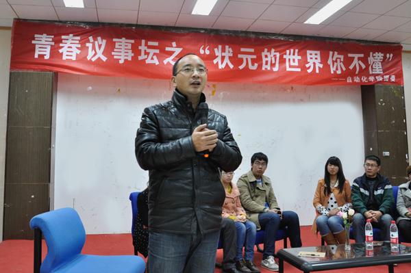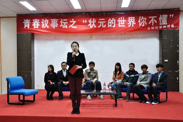 12月4日晚,青春议事坛之“状元的世界你不懂”活动于将军路校区艺术中心多功能厅举行,八名学生代表围绕“高考文科状元刘丁宁退学复读”事件展开了热烈的讨论。人文与社会科学学院教师娄和标、国产传媒 团委书记季娟以及各年级辅导员作为评委出席了本次活动。 2013年,辽宁省本溪市文科状元刘丁宁以668(+10)分被香港大学中文系录取,并获72万元人民币奖励。10月初,刘丁宁离开港大,目前已经回本溪高中复读。对此,刘丁宁说,她追求更纯粹的国学,梦想进入北京大学中文系,北大也更适合自己。 八名学生代表首先表明了各自的立场,支持刘丁宁的学生认为这位女生的可贵之处,在于她遵从了自己的内心,敢于放下一些功利的考量,去追求契合自己心灵的国学梦、北大梦;反对的同学则认为刘丁宁刚到港大,没有充分了解港大及专业情况,就仓促退学,是一种不成熟的举动。接着同学们从北京大学与香港大学教学理念的不同为切入点,深入探讨了有关中西方教育和人才选取倾向上的差异、大学生的适应能力等问题,并且从“状元的世界你不懂”这一议题联系到了大学生的实际生活。八名学生代表在思辨的讨论中碰撞出了思维的火花,呈现了不同思想对同一事件的不同解读,展现了当代大学生有思想、有创造力的青春风采。在学生代表的交流讨论中,现场观众们也就“如果你是刘丁宁会做何种选择”及“你是如何适应大学生活”的两个话题展开了激烈的讨论,现场气氛活泼热烈而又井然有序。 最后,西方哲学博士娄和标对本次青春思辨活动进行了总结。他说道,我们每个人都有各自独特的价值取向和自由选择权。只要这样的价值取向和自由选择权没有违法乱纪,也没有违背社会伦理道德,那么我们每个人就都应该尽可能地理解其价值取向和自由选择权。