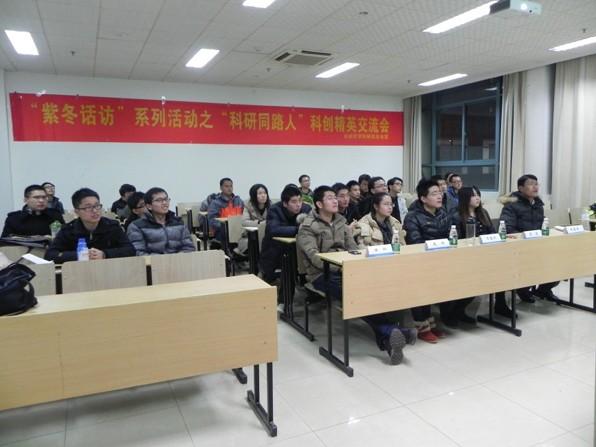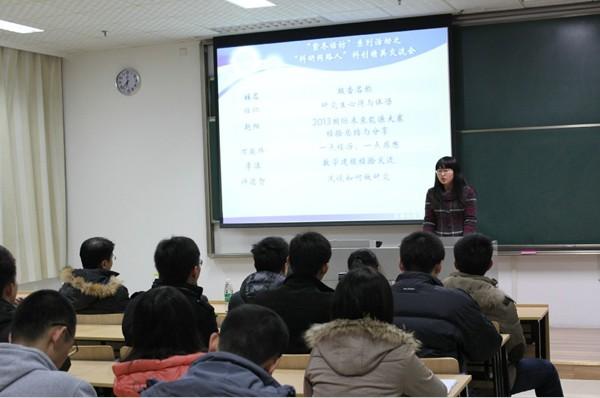 2013年12月10日晚6:30,由国产传媒 研究生会主办的“紫冬话坊”系列活动之“科研同路人”科创精英交流会活动在A18楼218教室顺利举行。本次活动邀请到国产传媒 硕士研究生任仁、李洁、万骏炜、赵阳以及博士研究生许德智五位学术精英为到场同学们作报告,研究生辅导员刘斐文老师也莅临现场出席了本次活动。