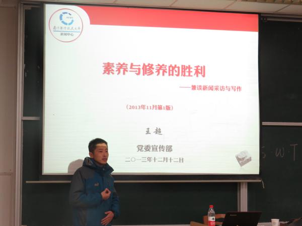 12月12日,国产传媒 第十三期S.W.T.工作坊之新闻采访与写作在将军路校区举行。本期工作坊由南航报编辑部主任王超担任主讲,院团委书记季娟作为嘉宾出席了本次活动。参加本期工作坊的还有2012、2013级的学生骨干。 在对南航国产传媒-国产传媒官方最新全集发布页进行简要介绍后,王超从政治家办报、历史家办报、新闻家办报3个话题引入对新闻工作价值观的探讨,强调好的新闻采写缘于正确的新闻价值观的确立,并简要阐述了“什么是新闻”“新闻基本特征”等基础新闻理论观点。在新闻采访业务指导环节,他指出,“七分跑,三分写”是新闻记者的重要素养,并引用20世纪初著名记者黄远生的“四能说”,阐述新闻记者应着重培养的四种新闻采写技能。针对同学们的具体采写需求,王超重点讲解了“消息”的写作要领,并以丰富的实例向同学们做了详细阐述。 在互动环节中,王超对活动现场同学提供的近期3篇新闻稿进行了点评和修改,并对同学提出的问题进行了一一解答。 培训最后,王超与大家共勉道:“我们都是南航的新闻工作者,讲述南航‘好’故事,传播南航‘好’声音是我们共同努力的方向”。