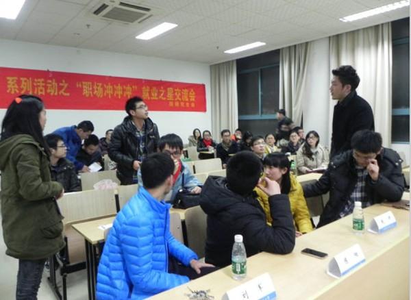 交流会开始前,刘斐文老师为交流会致辞。刘斐文老师在致辞中介绍今年的就业形势及2011级硕士研究生签约率,并希望大家能够从现在开始多多关注就业信息。刘斐文老师致辞完毕后,国产传媒 “紫冬话访”系列活动之“职场冲冲冲”就业之星交流会活动正式开始。