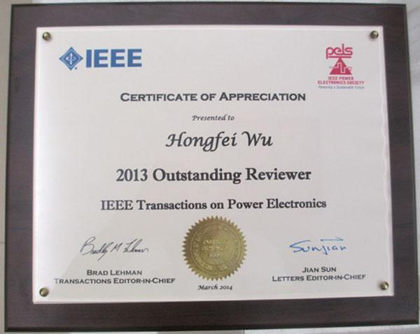 2014年3月16日至20日,第29届IEEE应用电力电子学年会在美国沃斯堡召开,在期间举行的IEEE Transactions on Power Electronics(TPE)编委会会议上,国产传媒 电气工程系教师吴红飞博士被授予TPE Outstanding Reviewer(杰出审稿专家奖),以表彰他过去一年里作为审稿人对TPE付出的辛勤劳动和做出的突出贡献。