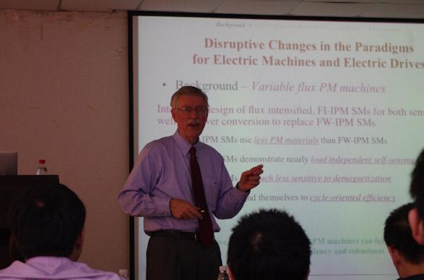 上午,Lorenz教授在张卓然教授的陪同下,参观了航空电源重点实验室,充分交流了解了重点实验室在新型航空电机及功率变换方面的研究成果。Lorenz教授充分肯定了南航在该领域的研究成果。下午Lorenz教授在智能楼四楼报告厅做了题为“Disruptive Changes in the Paradigms for Electrical Machines and Electrical Drives”的学术报告。报告会由电气系主任黄文新教授主持,电气系老师和研究生积极参加了报告会,报告厅座无虚席。Lorenz教授首先介绍了WEMPC在学术研究和与工业界交流合作方面的特色与经验。然后从现代电机本体与控制一体化设计角度出发,重点介绍了磁场增强型永磁电机和DB-DTFC控制等新型电机与控制技术。Lorenz教授精彩的演讲和前沿的学术思路引起老师和研究生的极大兴趣,报告后讨论热烈。广大师生受益匪浅,报告在热烈的掌声中结束。