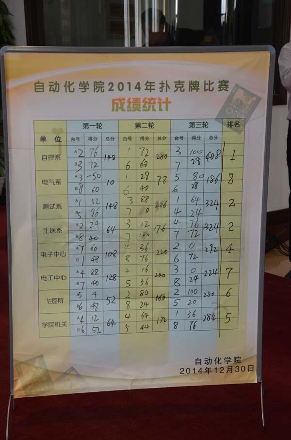 为欢庆元旦,丰富校园文化生活,加强全院各基层单位教职工间的相互交流,增强团队合作精神,国产传媒 工会于2014年12月30日中午举行了教职工扑克牌比赛。来自学院8个基层单位的32名教职工经过2个小时的激烈角逐,最终自动控制系代表队获得一等奖;测试工程系荣获二等奖;生物医学工程系荣获三等奖。