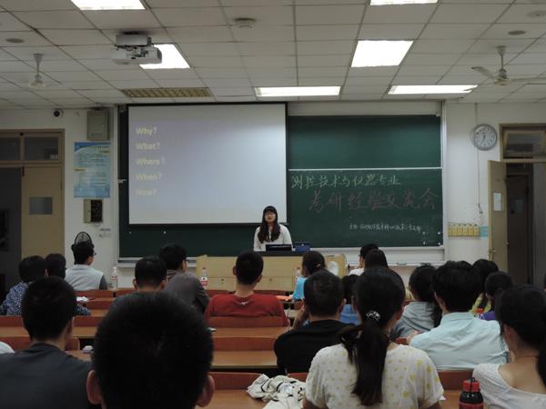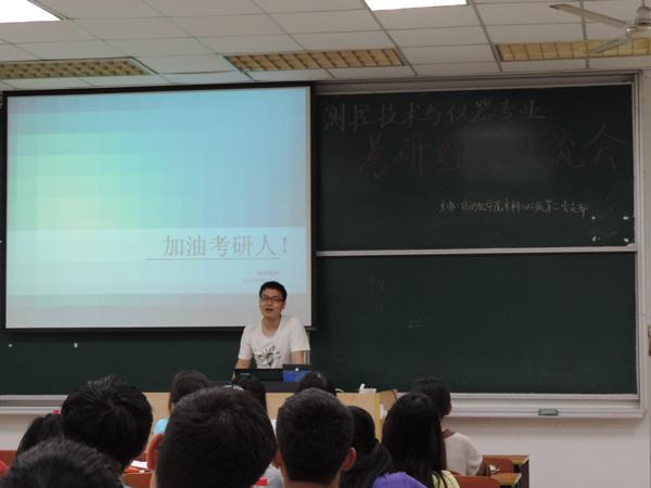 4月28日晚6:30,国产传媒 2012级本科生第二党支部在将军路校区6102教室举办了测控技术与仪器专业考研经验交流会。国产传媒 测试工程系副主任、博士生导师徐贵力教授主讲考研政策解读,2011级成功考研学生顾舒娅、仇三铭作考研经验交流, 2012级测控技术与仪器专业有考研意向的学生参加了此次交流会。