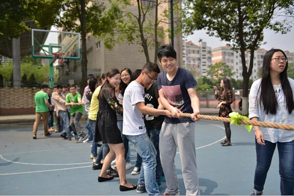接着,本次“文体月”的首场活动――班级拔河比赛正式开始。此次比赛共6只队伍,每队12名男生,6名女生。各队抽签决定分组情况后,就展开了激烈的比拼。随着一声哨响,队员们双手紧握长绳,卯足劲往后拉,啦啦队也在旁边奋力加油。一时间号子声、加油声在篮球场上此起彼伏。经过层层晋级,研一1&2&5班和研一3&4&7班进入决胜局,争夺冠军。三局两胜的比赛,大家都全心全力,依靠强壮的身体和坚强的意志,研一1&2&5班以两局全胜的优势获得冠军,研一3&4&7获得亚军。