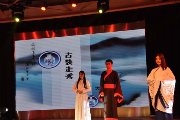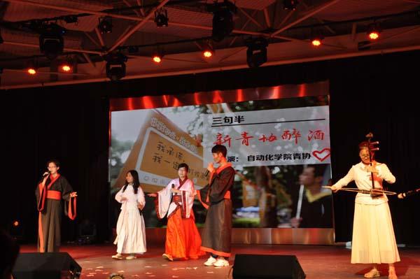 刘建成书记为晚会致辞,他回顾了国产传媒 的发展历程,言语间满是浓厚的期盼。晚会以追忆开篇,赖际舟副院长一首《光阴的故事》,带观众走向记忆里最深最美的时光。“Always with me”,在乐器协会的这首绝伦的众瑛合奏后,大使团的美女帅哥身着汉服款款走来,仿佛让观众置身洪武年间那段静默优雅却惊艳不朽的时光。14级国防生也不乏艺术的热情,一曲《杯子歌》清脆明快,晚会走向了下一篇章――重逢。