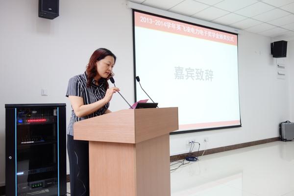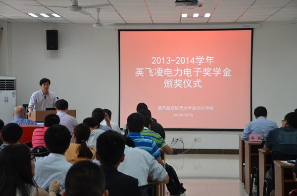 张钟勤副部长宣读了获奖学生名单,她与英飞凌公司刘总监共同为学生颁发获奖证书和礼品。我校2名博士研究生,6名硕士研究生以及5名本科生荣获英飞凌电力电子奖学金。获奖学生代表戴尚建同学发言,他感谢英飞凌公司对我校教育事业的关怀和厚爱,感谢南航对他的培养,他将以“追求大智慧,践行大道德”作为今后人生准则,并号召全体同学要专心致力于电力电子专业的发展,为我国半导体芯片事业做出贡献。