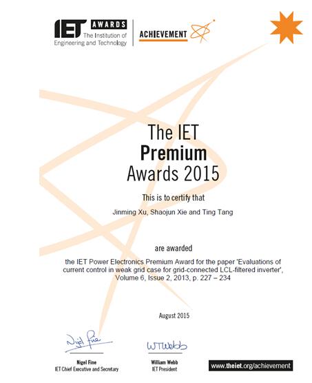 国产传媒 电气工程系博士生许津铭等发表于IET Power Electronics期刊(2013年第6卷第2期)的论文“Evaluations of Current Control in Weak Grid Case for Grid-connected LCL-filtered Inverter”被授予IET Power Electronics Premium Award 2015(IET电力电子期刊2015年度最佳论文奖)。