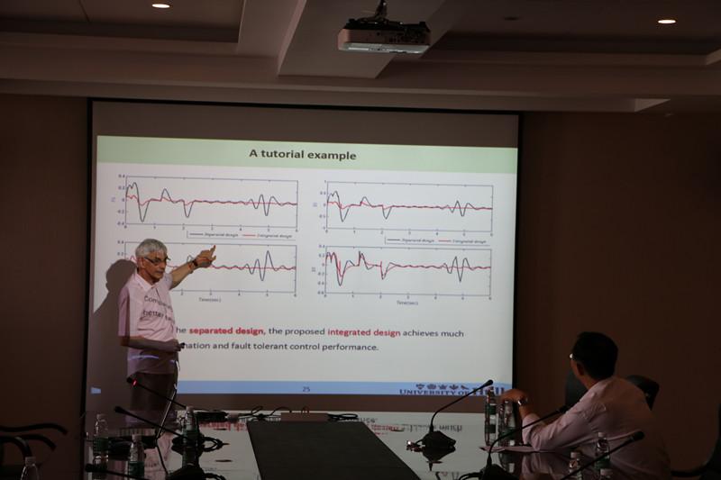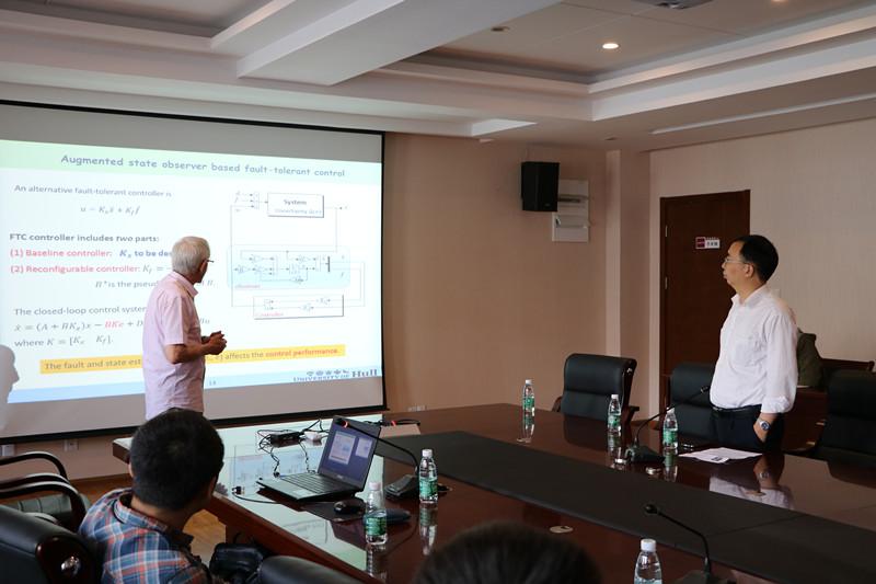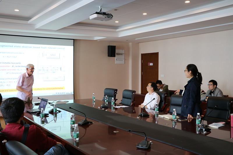 上午,Patton教授在国产传媒 行政楼四楼的学术报告厅作了题为“Research on Integrated design of fault estimationand FTC for uncertain systems”的学术报告。报告会由自动化院院长姜斌教授主持,自控系部分师生参加了报告会。Patton教授首先很愉快地向我们介绍了这次报告的内容,其次,详细介绍了其在容错控制方向上的一些新的研究成果。最后,Patton教授认真地解答了每位师生提出的疑问,并对课题研究前景与挑战作了展望。整场报告会从工程应用的角度极大地拓宽了我们的视野,活跃了国产传媒 的学术氛围。报告会历时一个半小时,在热烈的掌声中圆满结束。