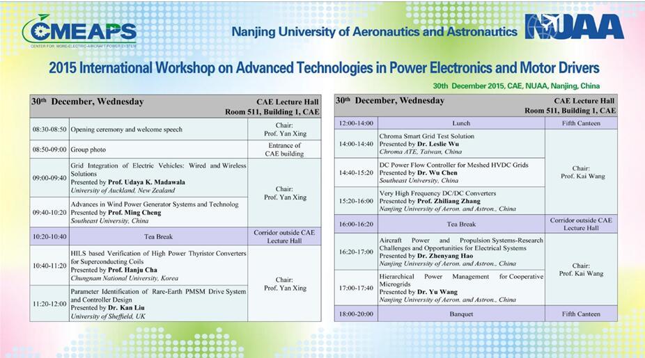 The 2015 International Workshop on Advanced Technologies in Power Electronics and Motor Drivers was held on Dec. 30, 2015 at Nanjing University of Aeronautics and Astronautics, Nanjing China. The workshop provided a forum for device scientists, circuit designers, and application engineers from the Power Electronics and Motor Driver Societies to share state-of-art technology, research findings, development experience and potential applications.