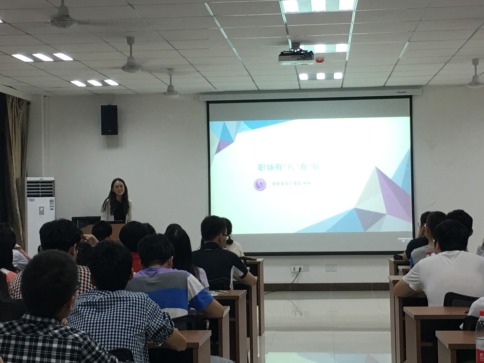 5月30日晚7点,本科2013级在将军路校区国产传媒 1号楼303报告厅举办职场礼仪培训讲座。讲座邀请了大使团礼仪队的两位同学,从面试礼仪、面试服装和化妆技巧三个方面指导2013级的同学们如何在职场中做到有“礼”有“仪”。