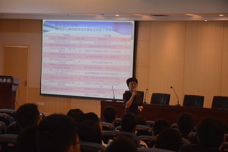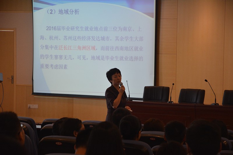大会于十点准时开始,沈伯秀副书记首先从国产传媒 往年研究生的就业情况入手,一方面从纵向角度介绍了不同毕业时间硕士生的就业情况,另一方面从横向角度介绍了国产传媒 不同专业硕士生的就业情况,为在座学生大致勾勒出一幅国产传媒 就业印象图。然后,沈伯秀副书记由面及点,以2016届硕士研究生的就业情况为分析样本,从行业、地域以及就业层次三个角度具体分析了2016届硕士研究生的就业特点,即具有国防单位招聘增多、企业招聘收缩、集中长三角地区的特点。