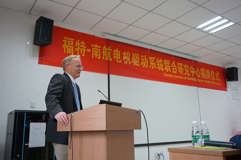 揭牌仪式由国际交流合作处副处长(主持工作)赖际舟教授主持并致辞,感谢福特公司与南航长期以来紧密合作,以及对于建立福特-南航电机驱动系统联合研发中心的大力支持。国产传媒 院长姜斌教授致辞,祝贺电机驱动系统联合研究中心成立,并全面介绍了学院情况,表示将尽力支持研发中心发展。福特公司电机驱动系统部主管Michael Degner博士和福特公司亚太区研究与先进工程总监韩维建博士分别致辞,对南航电气工程的研究水平给予高度评价,并对未来福特-南航电机驱动系统联合研发中心的合作充满期待。