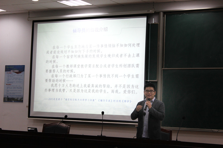 年级会伊始,侯新闻老师播放年级中心组精心制作的短视频,带着同学们回顾入学以来所经历的成长与蜕变,并提出“学习共同体”的主题。之后从“导员心中的学生”、“学生心中的导员”、“导员的自我理解”等方面分步解释了“学习共同体”中老师与学生两大对象的关系。侯老师轻松幽默的讲话不时逗乐了同学,更让同学们深层次地了解到辅导员工作的辛苦以及对学生们的关爱,拉近了辅导员与学生的距离。
