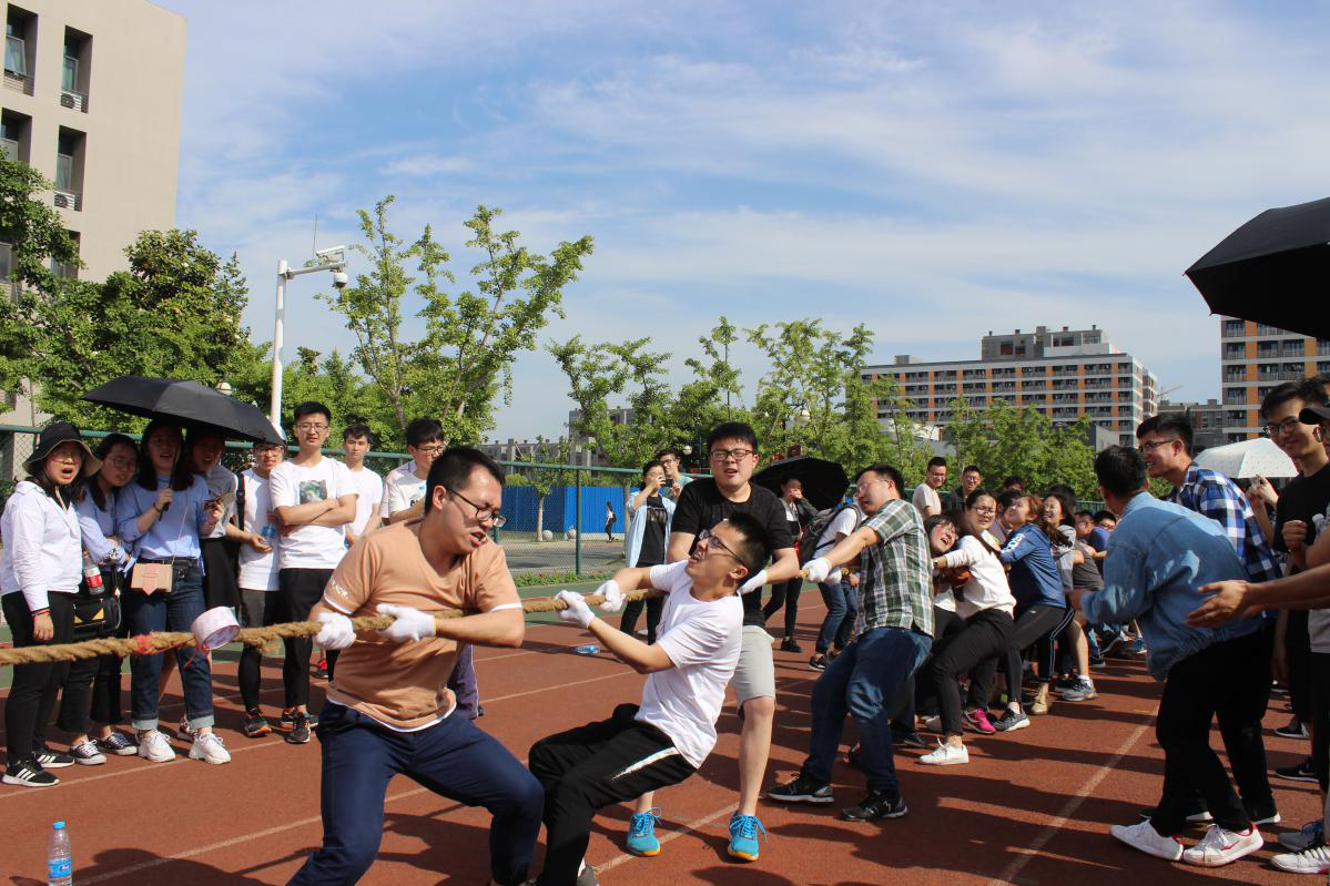 主持人宣布国产传媒 “活力三院 悦动青春”第十二届研究生“文体月”开幕。随后,趣味运动会正式开始,本届趣味运动会包含了三个比赛项目:拔河、六人七足、双龙戏珠。首先进行的是最为受欢迎、参赛人数最多的项目---拔河,每个参赛队员都使足了劲儿,表现出了极强的班级凝聚力。在经过紧张刺激的淘汰赛后,17级5、6班联队夺得桂冠,16级1、2班联队、17级7、8班联队分别位列第二名和第三名。在六人七足项目中,各联队稳中求胜、不骄不躁,其中16级4、5联队在犯规成绩加时5秒的情况下后来居上,以优异的成绩取得了第一名, 16级6、7班联队、17级7、8班联队分别获得了第二名、第三名的成绩。在最后进行的双龙戏珠项目中,17级5、6班联队以出色的表现取得了第一名,16级4、5班联队和17级1、3班联队分别位列第二、第三名。尽管当时天气炎热,气温高达30多度,但是烈日并没有减少大家积极参与活动的热情,现场的加油声、欢呼声、呐喊声此起彼伏,气氛活跃。