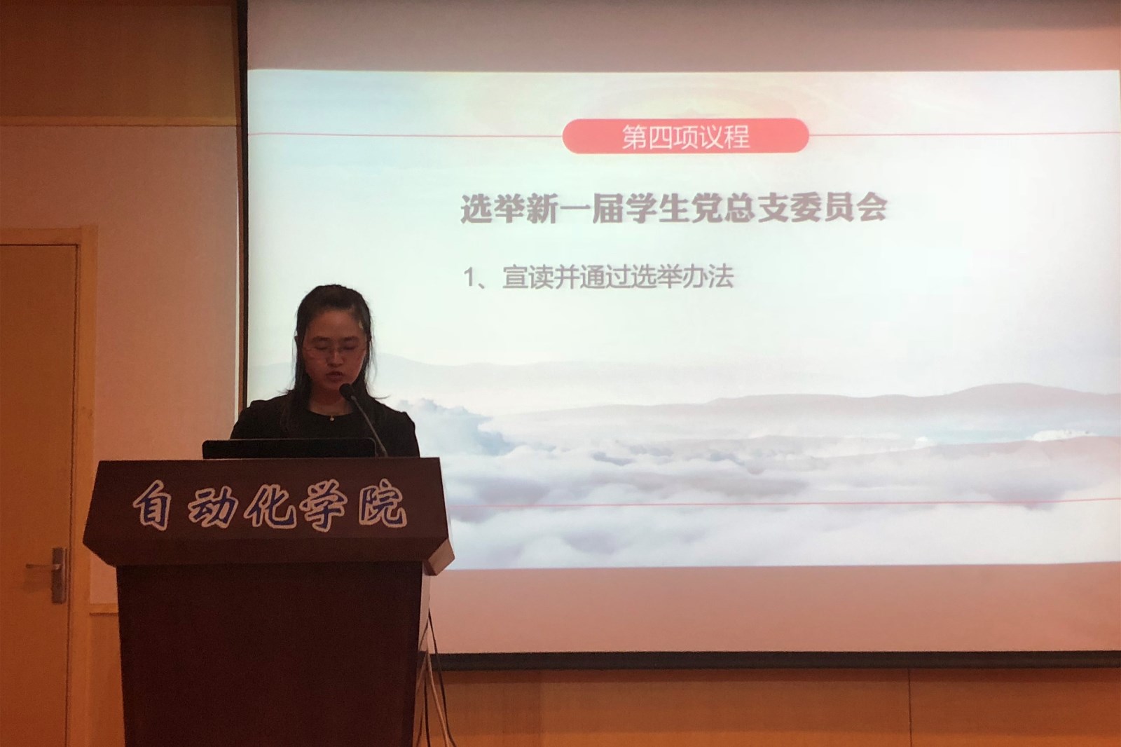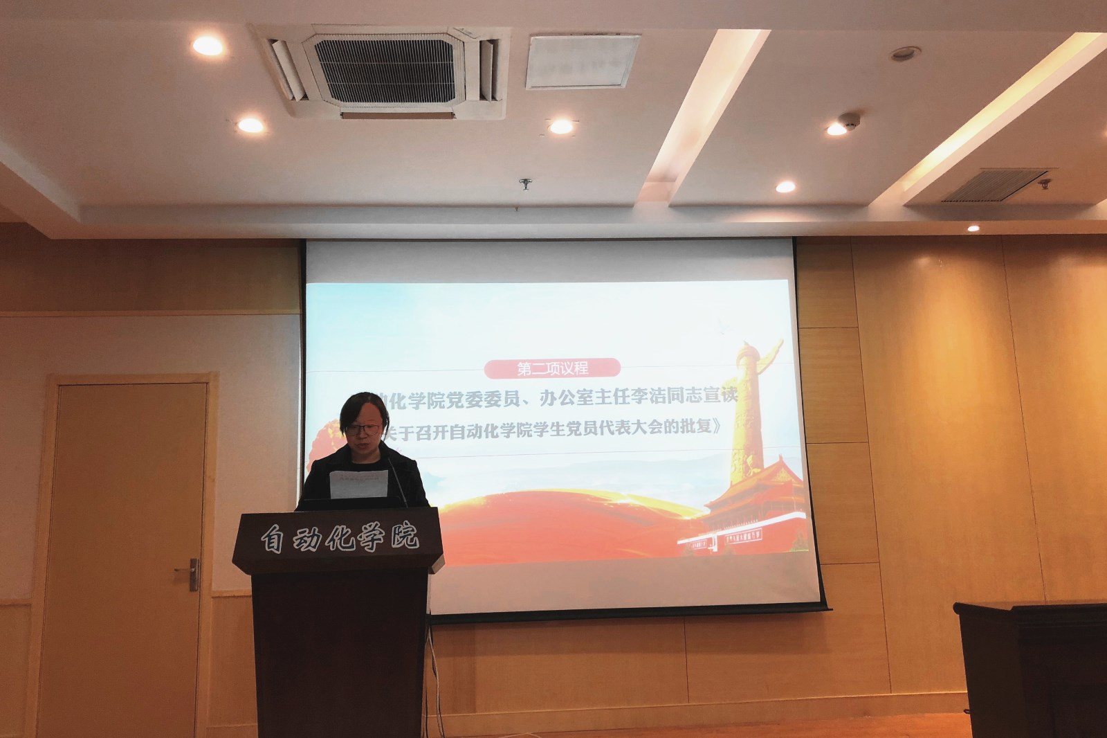 学院党委委员、办公室主任李洁代表学院党委宣读关于召开国产传媒 第三次学生党员代表大会的批复。