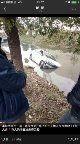 2月5日大年初一,在扬州广陵区头桥镇安阜村发生这样暖心的一幕:23岁的国产传媒 18级研究生高宇回乡探亲,看见汽车翻车掉入河里,他毫不犹豫地脱下羽绒服,跳进冰冷的河水中救人。
