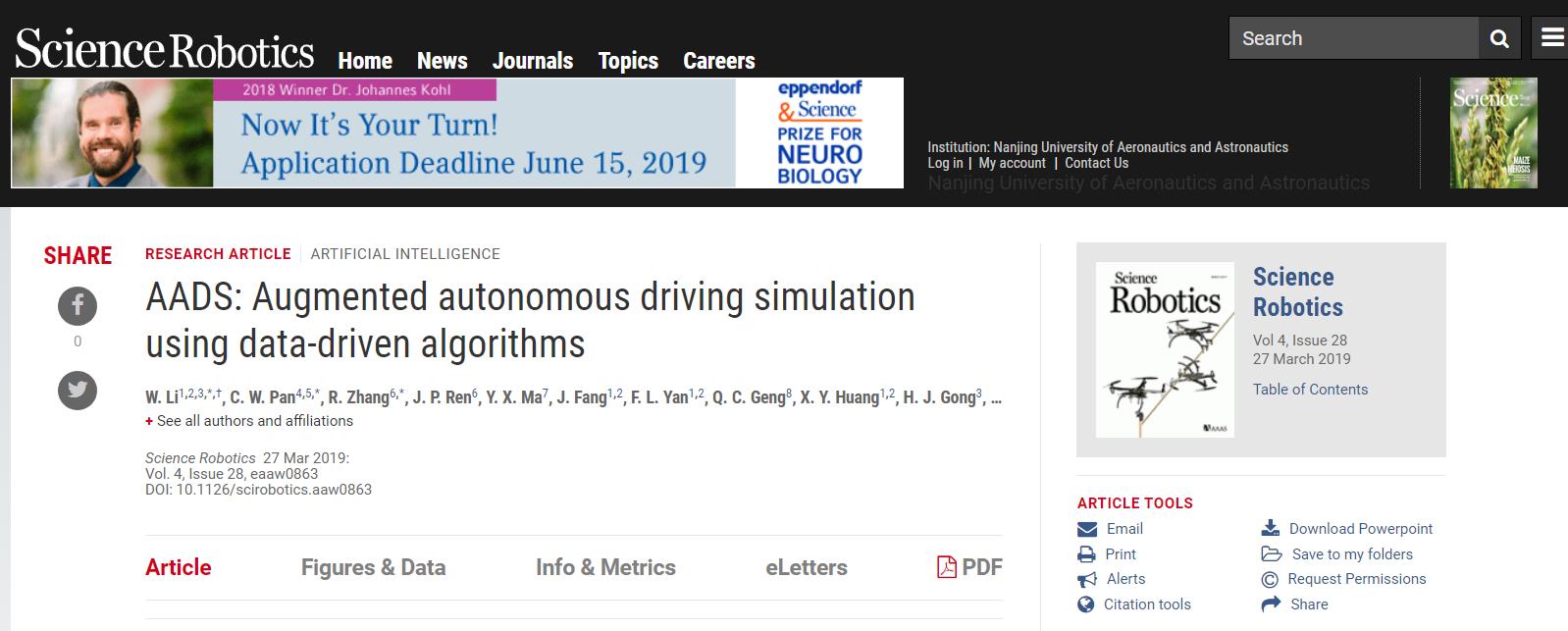 近日,我校自动化博士生李伟以第一作者和共同通讯作者身份,在《科学》杂志子刊《科学·机器人学》(Science Robotics)上刊登发表的学术论文“AADS: Augmented Autonomous Driving Simulation Using Data-Driven Algorithms”,该论文突破了现有的自动驾驶仿真技术存在的许多障碍。