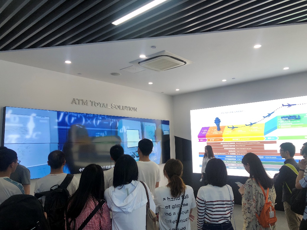 在中午感受了莱斯集团舒适的就餐环境及可口的饭菜之后,同学们前往了中电二十八所东区,在东区联合厂房观看了莱斯集团所研制的军、民用软硬件系统和装备,其为军事演习、抢险救灾、大型活动等提供重要保障。在民航空管中心,讲解员对流量管理,自动化系统,通航服务,ADS-B数据中心,远程塔台,集成塔台等作了详细的介绍。随后又了解了高分系统重大专项中的国家高分重大专项、高分系列卫星、高分省域中心等,拓宽了视野。