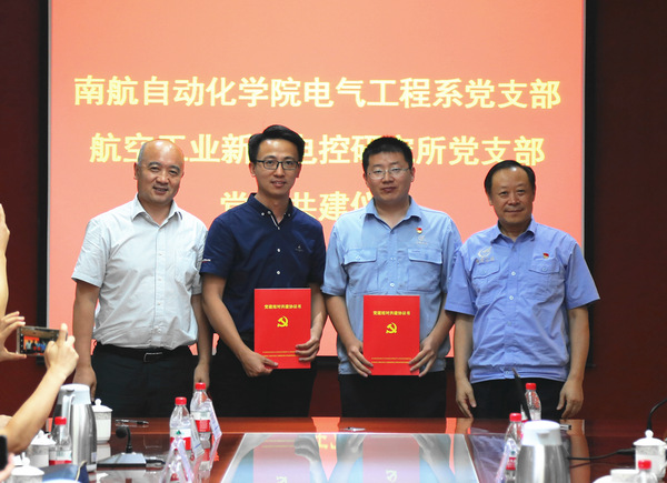 电气工程系党支部书记魏佳丹就电气党支部的科研合作、党建工作进行了汇报,新航集团电控研究所党支部书记谢学坤就目前研究所党支部的人员组成以及党建规划和发展情况进行了汇报。共建仪式上,在刘建成书记和高海军董事长的见证下,电气工程系党支部书记魏佳丹与电控研究所党支部书记谢学坤签订党建结对项目协议书。