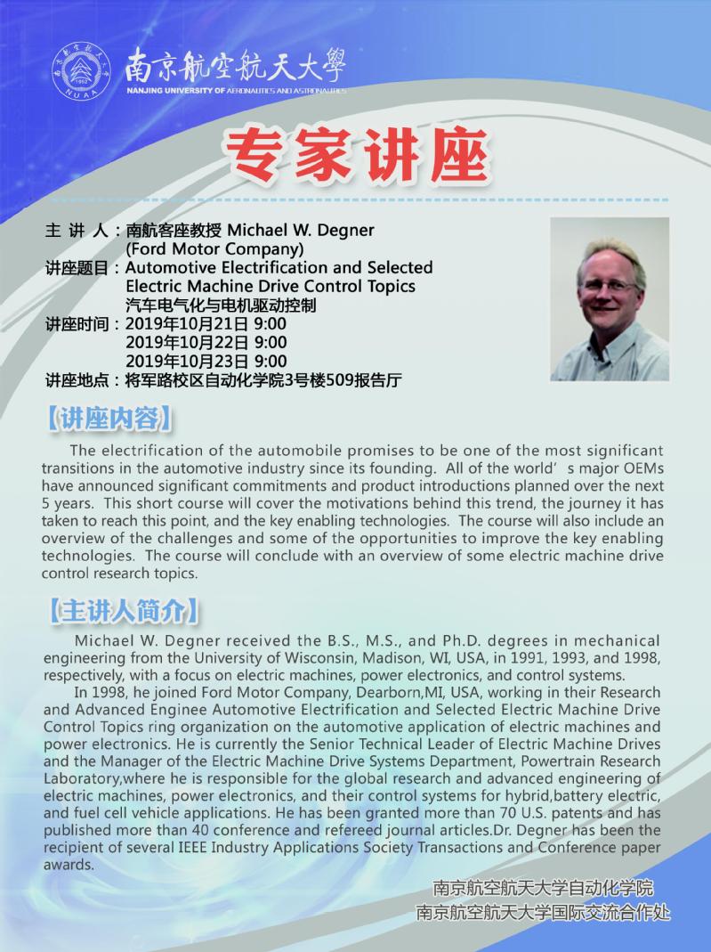 学术报告:Automotive Electrification and Selected Electric Machine Drive Control Topics