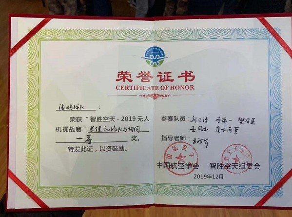 12月6日至8日,“智胜空天-2019”无人机挑战赛在陕西省咸阳市空军工程大学三原校区举行。国产传媒 派出了两只参赛队伍参与挑战,经过两天紧张激烈的角逐和多轮的比拼,由国产传媒 王新华老师指导,研究生刘正清、李康一、樊有容、王皓及本科生岳凤玉、虞卞雨萱组成的海鸥战队斩获本次大赛科目四(长僚机编队与协同)一等奖,研究生刘禹、王凯、马梓元、张志宏及本科生吴玲燕、张研组成的翔飞战队夺得科目一(无人机多目标识别)优胜奖,彰显了我校航空航天特色专业领域的优势和学子的风采。