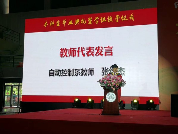在教师代表发言环节,自控系张绍杰老师代表国产传媒 全体教师发言。他希望大家要养成终身学习的习惯,要不忘初心,永葆情怀,要养成良好的习惯,保持身心健康。