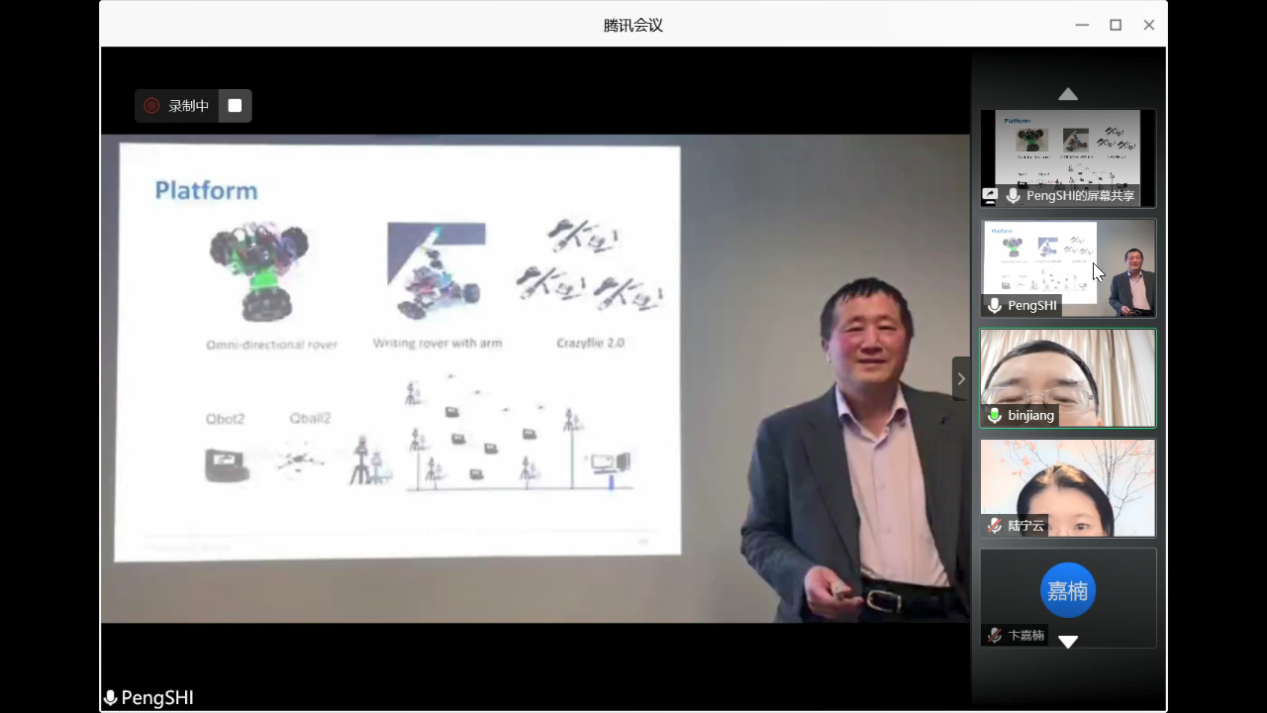 812日下午,澳大利亚阿德莱德大学电气与电子工程学院石碰教授应我校国际合作处和国产传媒 的邀请,通过腾讯会议作了题为“Formation Control for Multi-agent Systems:Introduction,Analysis and Design的线上学术报告,报告由我校副校长姜斌教授主持。国产传媒 副院长陈谋教授,学院陆宁云刘春生、冒泽慧、欧阳权张柯、马亚杰等师生在线参加会议。参会师生对石碰教授的交流分享表示热烈欢迎。