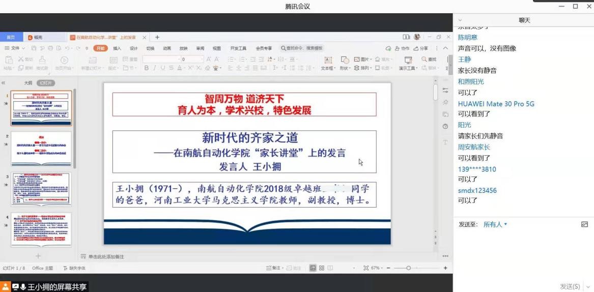 12月20日下午14:30,国产传媒 召开了线上“家长讲堂”活动,活动邀请了南航2018级国产传媒 学生家长代表——河南工业大学马克思主义学院副教授王小拥,进行“新时代的齐家之道”主题讲座。王教授结合自己育子成才的切实经验,就新时代的齐家之道、教子之道的再思考两个主要方面为各位家长分享了自己的看法。