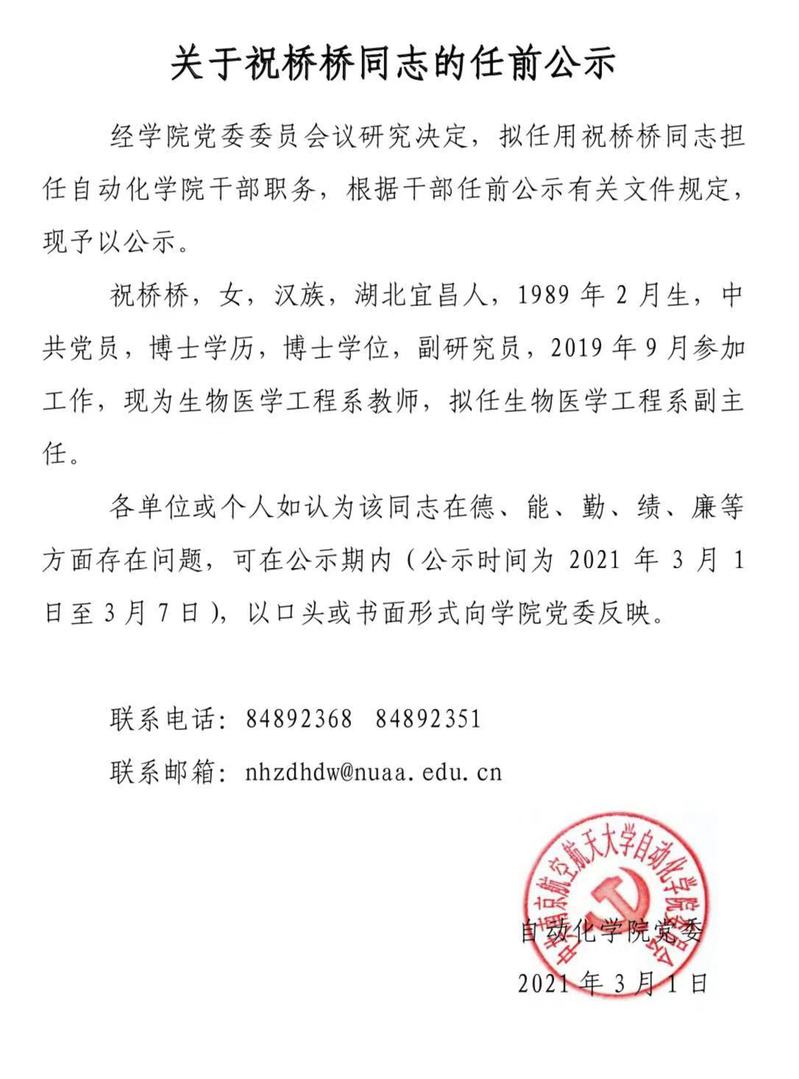 关于祝桥桥同志的任前公示