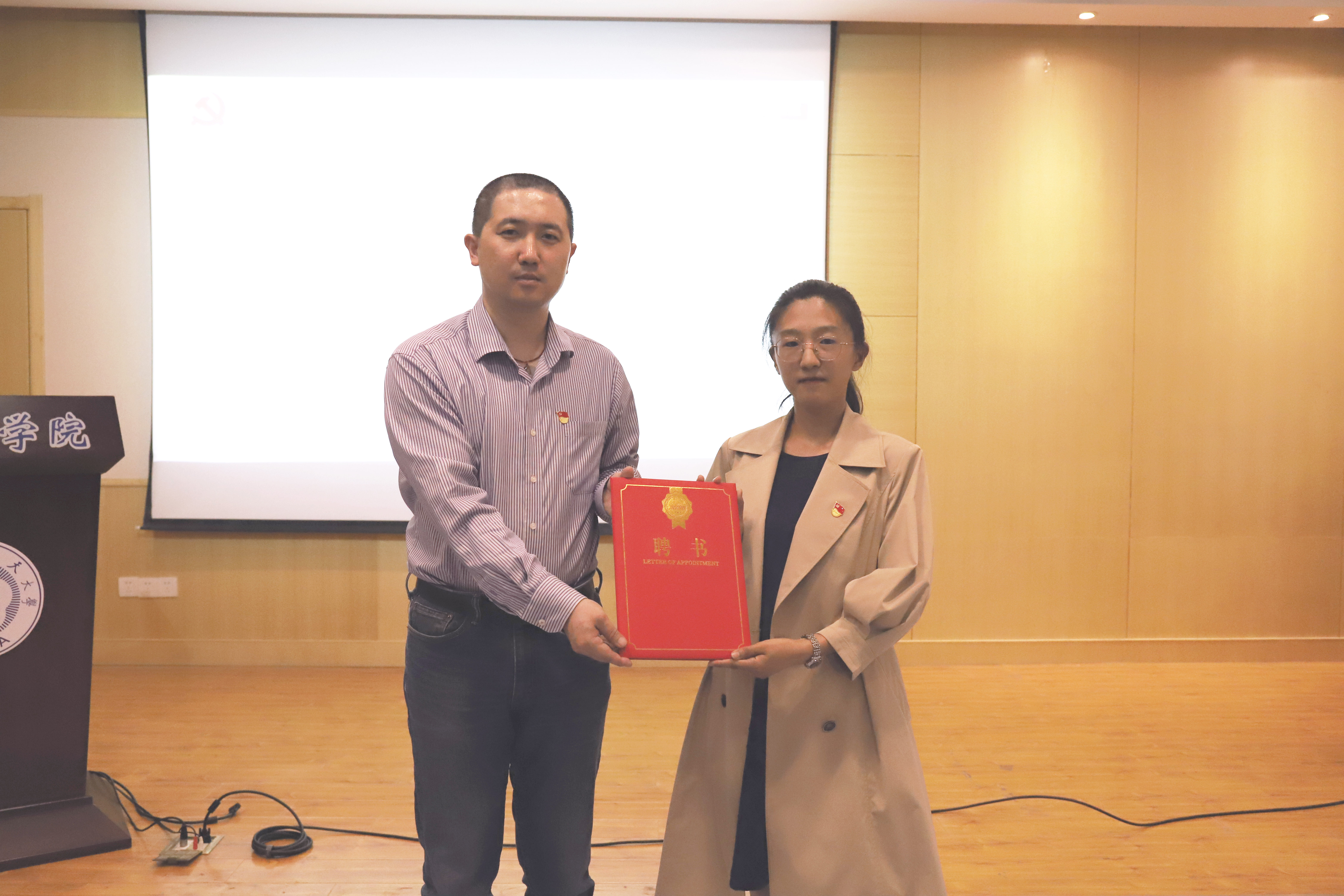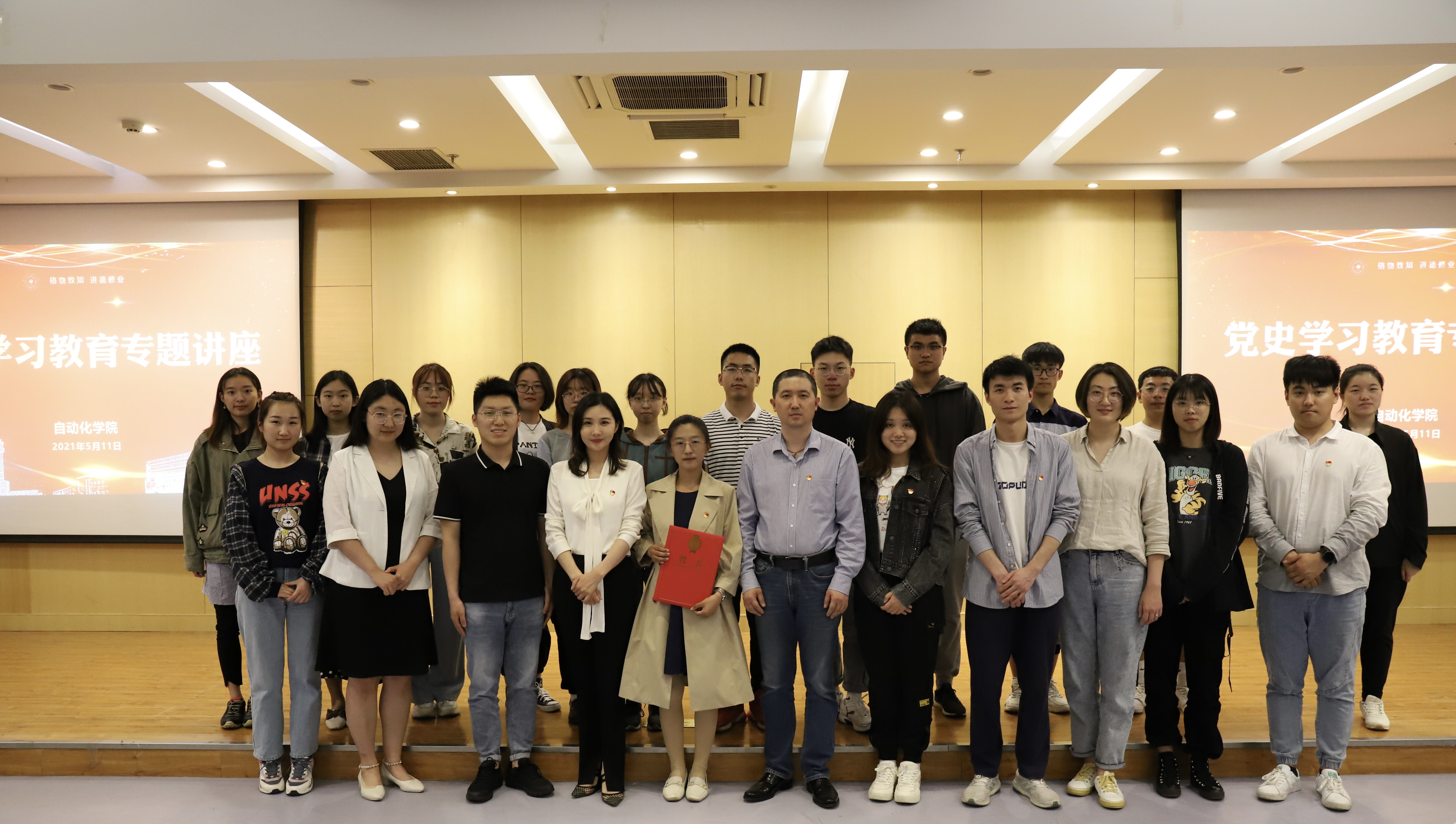 讲座结束后,丁琛为宋青励同学颁发思政证书聘书,并与学生代表一起合影。