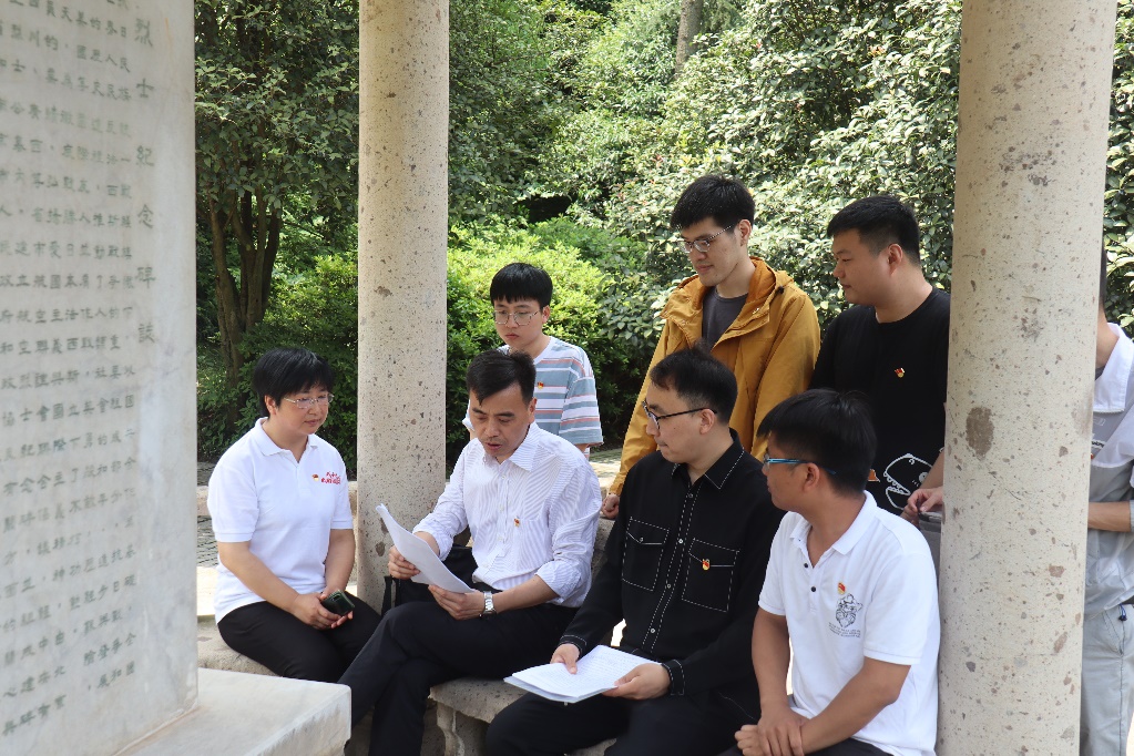 在碑亭中,图书馆第四党支部书记张光磊老师给大家领学了《中国共产党普通高等学校基层组织工作条例》。作为基层党组织的成员,我们应当严于律己,时刻严格遵守工作条例,珍惜工作成果,共同维护基层组织。