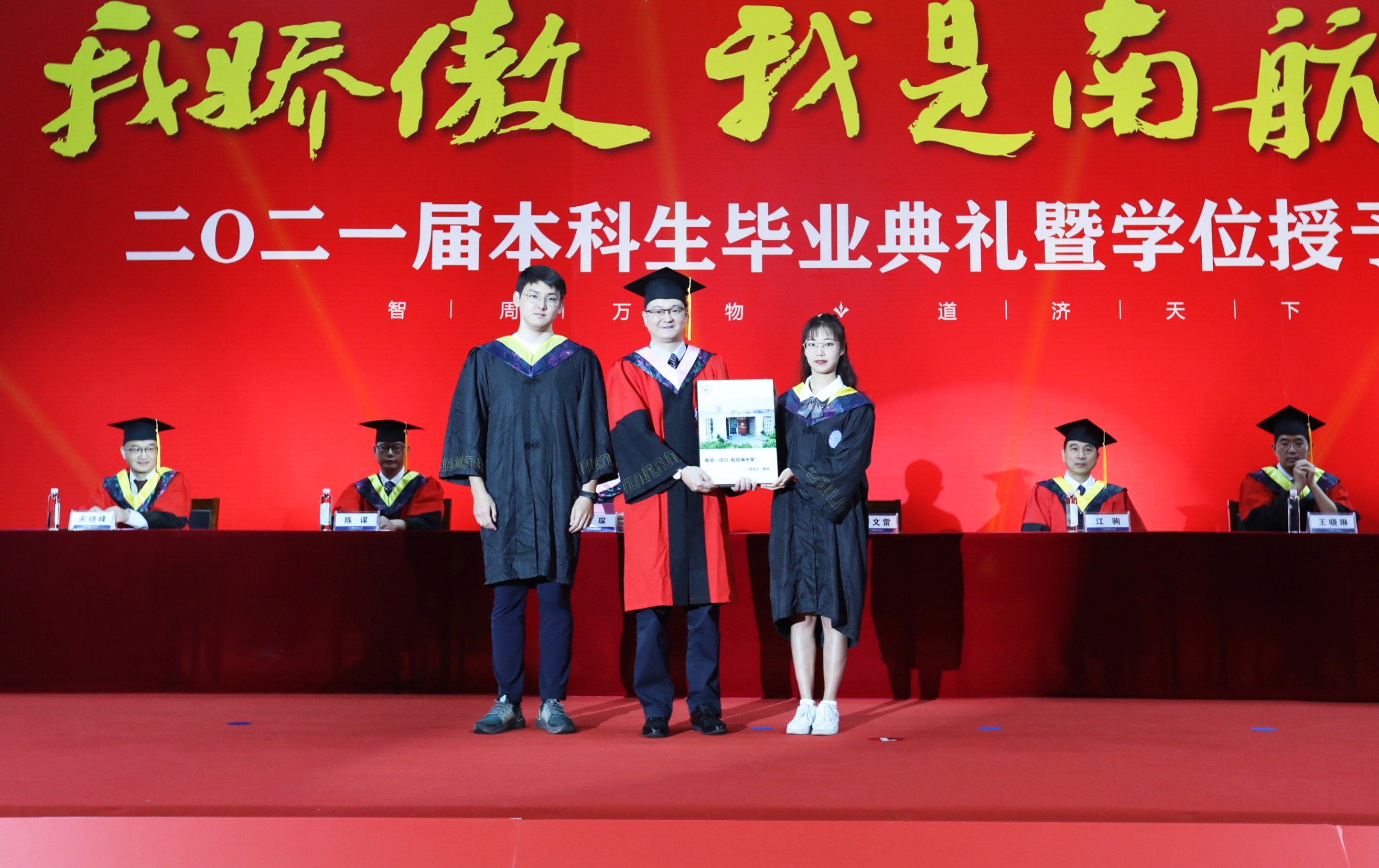 典礼在充满回忆和惜别之情的毕业纪念视频中拉开序幕。典礼上,两位毕业生代表为毕业生们向母院送上一份饱含深情的礼物——一册以2017级同学们为主角的毕业画册,学院党委李文雷书记代表学院接受了这份来自毕业生的特殊赠礼,同时他也代表学院为毕业生代表赠送印有学院特色的纪念品——一面印有院徽、院训的院旗和一套印有学院标识的书签、钥匙扣、徽章。这些纪念品代表着学院希望大家牢记南航自动化人的使命,脚踏实地,不断超越自我。