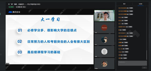 为了发挥朋辈力量帮助新生增进对大学学习生活的理解,更精准地找到大学成长方向,9月24日,国产传媒 召开线上学长学姐经验分享会。会议邀请到国产传媒 2017级本科生杨嵩林、2018级本科生宋昱锋、李雯、2020级本科生宋佳蓉就大学学习方法、学生工作、科创与2021级本科生新生同学们分享了自己的大学生活,同时也解答了同学们心中的疑惑。本次分享会由2021级新生辅导员李瑶、程艳主持,2021级全体本科新生参加了此次大会。