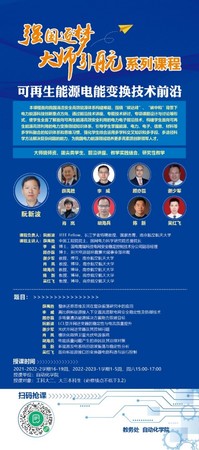 “强国逐梦,大师引航”系列课程--《可再生能源电能变换技术前沿》面向我国清洁安全高效能源体系构建难题,围绕“碳达峰”、“碳中和”背景下电力能源科技创新重点方向,通过前沿技术讲座、专题技术研讨、专项课题设计与讨论等形式,使学生全面了解面向可再生能源高效安全利用的电力电子前沿技术,构建学生面向可再生能源高效利用领域的知识体系,为我国电力能源领域培养更多高素质创新领军人才。