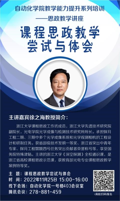 2022年11月25日下午,国产传媒 邀请到浙江大学徐之海教授作题为《“课程思政”教学尝试与体会》的线上专题讲座。本次讲座由国产传媒 副院长魏佳丹主持,学院党委书记李文雷、院长陈谋、各系所中心教学副主任、近三年入职青年教师和教学办全体老师出席活动。讲座采取线上、线下相结合的方式,全校50余名专任教师听取了报告。