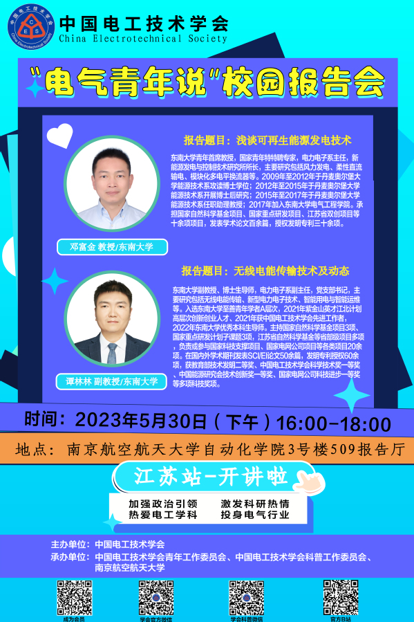 【学术报告】“电气青年说”校园科普报告会-《浅谈可再生能源发电技术》、《无线电能传输技术及动态》