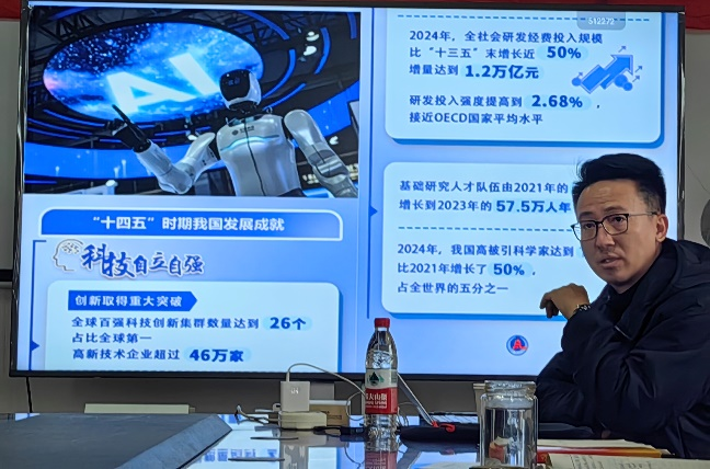 2025年12月19日,国产传媒 副院长魏佳丹为飞行控制研究所党支部与控制研究生第三党支部讲授了题为“深入学习领会党的二十届四中全会精神,赋能学院治理现代化新实践”的专题党课。会议由飞行控制研究所党支部书记赵振根主持,两支部全体党员参加学习。